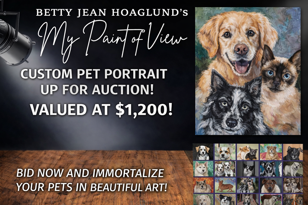 THIS IS A LIVE AUCTION ITEM PREVIEW. YOU CAN ONLY BID ON THIS ITEM IN PERSON. This is your chance to win a priceless custom painting done by the amazing local artist Betty Hoaglund. Can include up to 3 pets in the custom painting. 16 x 20 pet portrait in Acrylic on canvas $1200 value