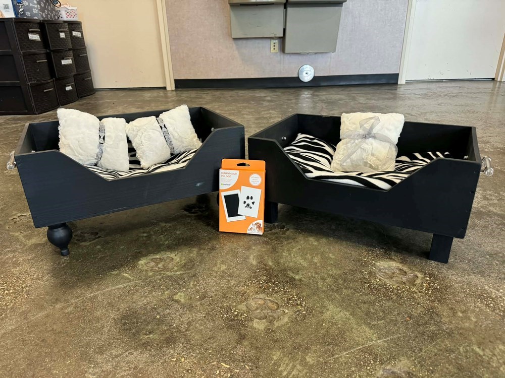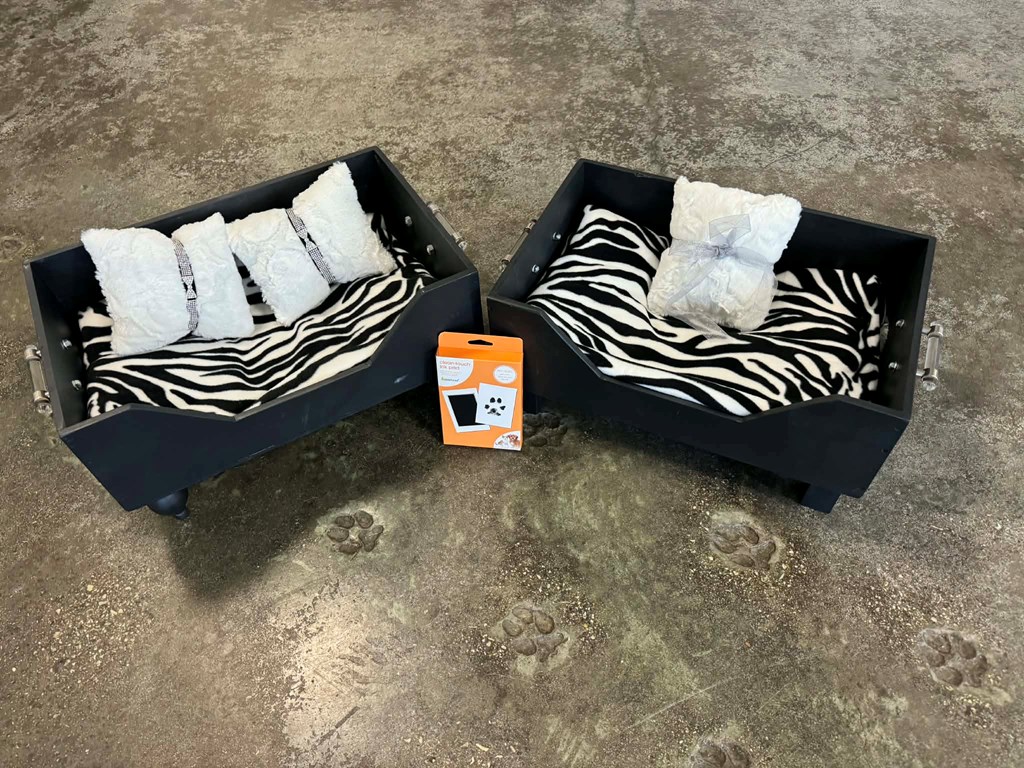 Don't miss your chance to take home this package with TWO sleek black custom-made pet beds made from Chateau De Grezels Wine Enthusiast Wine Box, complete with cozy zebra print blanket and matching custom-made faux fur pillows encased in two black rhinestone collars. Top this package off with commemorative paw print pad to preserve everlasting the memories of your pet(s). Don't delay and bid on this one-of-a-kind, handmade pet Safari Chateau bed combo today!