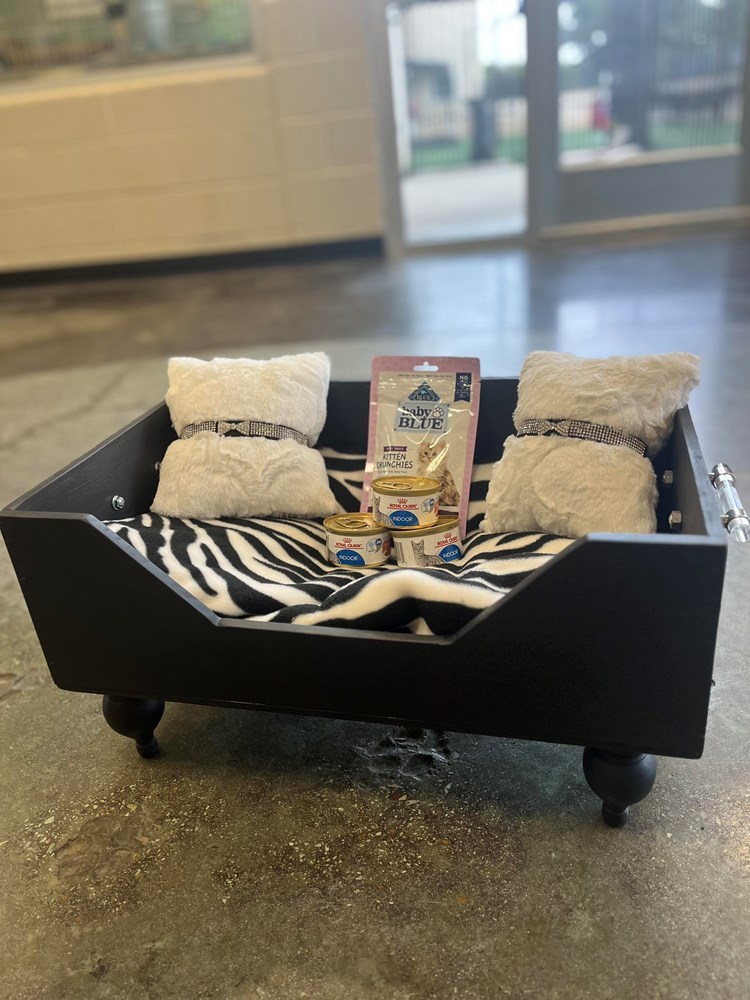 Don't miss your chance to take home this sleek black custom-made pet bed made from Chateau De Grezels Wine Enthusiast Wine Box, complete with cozy zebra print blanket and matching custom-made faux fur pillows encased in two black rhinestone collars. Top this package off with delicious treats and plush pet toys for the ultimate pet delight. Don't delay and bid on this one-of-a-kind, handmade pet Safari Chateau today!