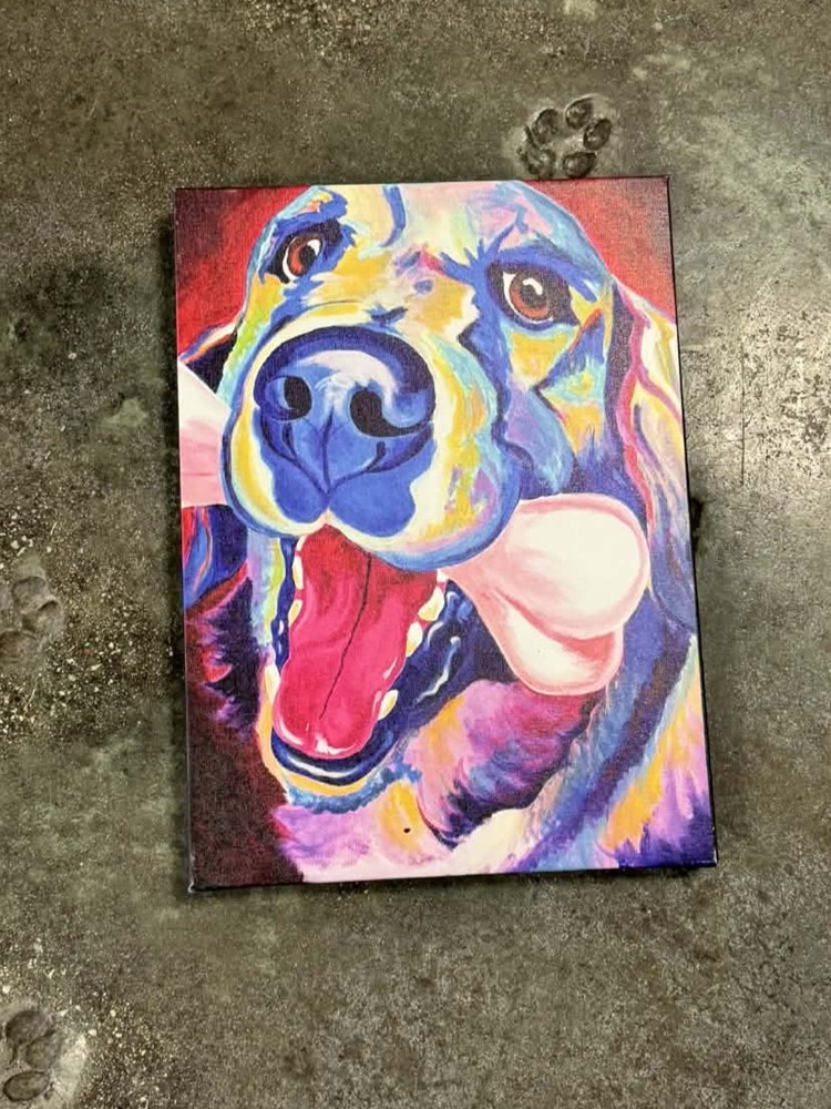 The painting in the image is titled My Favorite Bone Reboot, created by the artist known as DawgArt (Alicia VanNoy Call). Size: 18 x 14 gallery-wrapped canvas print Style and Purpose: The artwork features a colorful, pop-art style portrait of a dog. The artist states that "DawgArt is meant simply to bring happiness to people and to help us remember our connection with Nature". Artist Background: Alicia VanNoy Call has been creating art under the name DawgArt since 2003, drawing colorful inspiration from the Desert Southwest. The artist works with various animal rescue and shelter groups, donating artwork to fundraising auctions to promote awareness and provide direct care for animals in need.