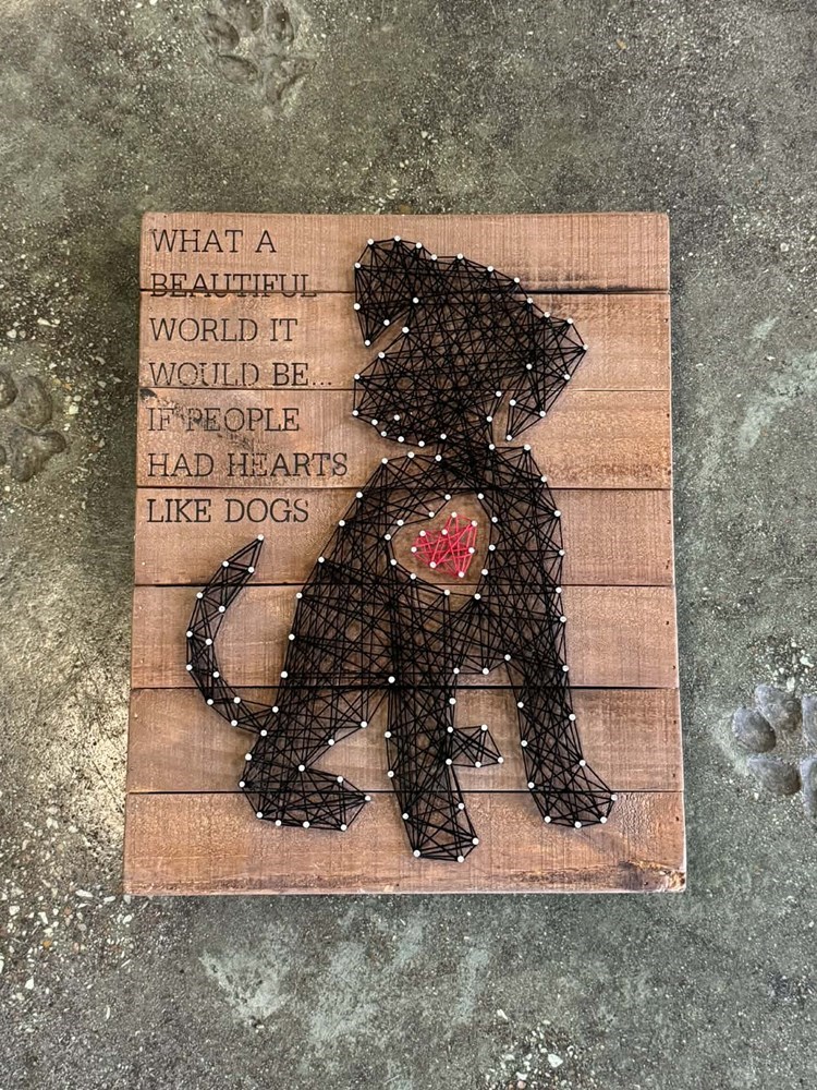 Hearts Like Dogs String Art Box Sign 12 x 15" Primitives By Kathy STRING ART: Primitives by Kathy wood box sign featuring a hand-strung puppy and heart design SENTIMENT READS: What A Beautiful World It Would Be... If People Had Hearts Like Dogs RUSTIC DISTRESSED STYLE: Slat wood style sign with rounded edges and corners for a distressed look STURDY CONSTRUCTION: Measures 12 x 15-inches; designed to freely stand on its own or hang on a wall SAY IT WITH SASS: Hilarious, sarcastic or heartwarming - Primitives by Kathy has just the right gift to tell them how you really feel