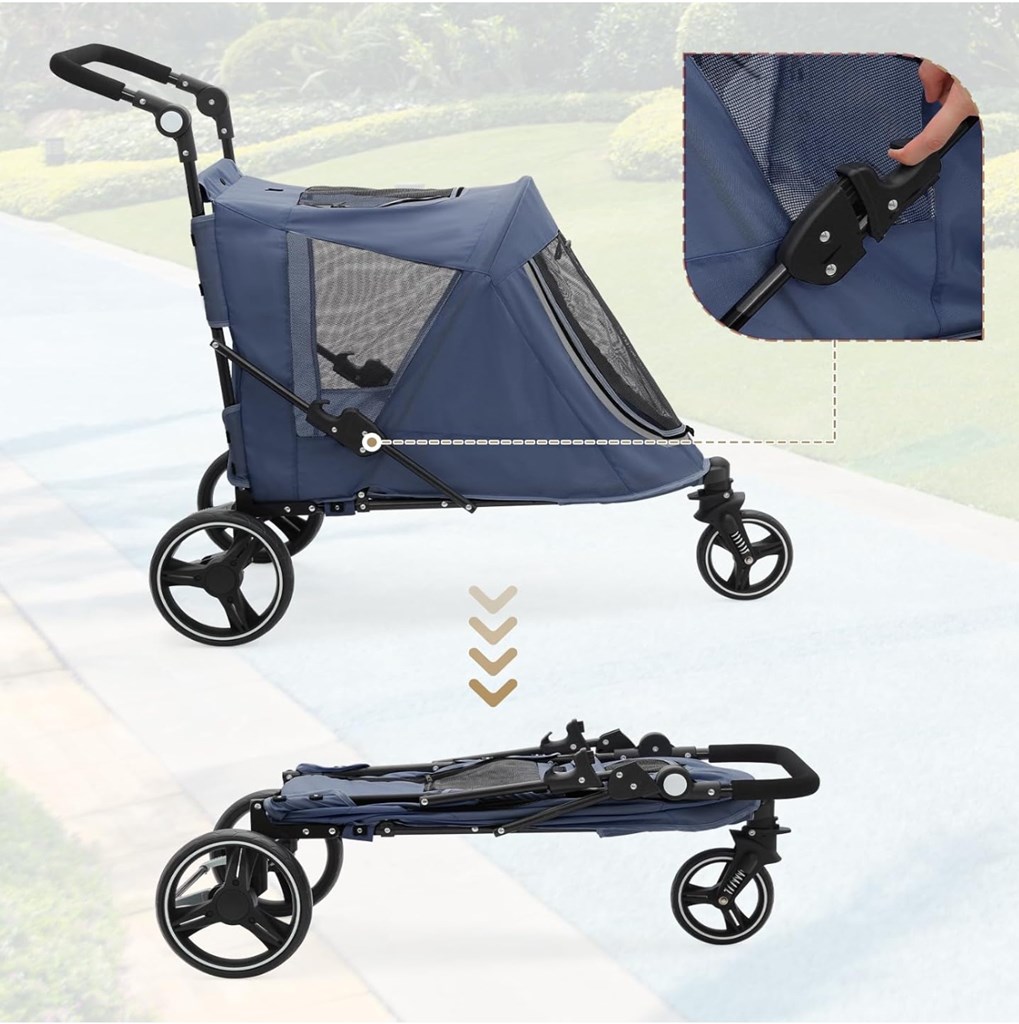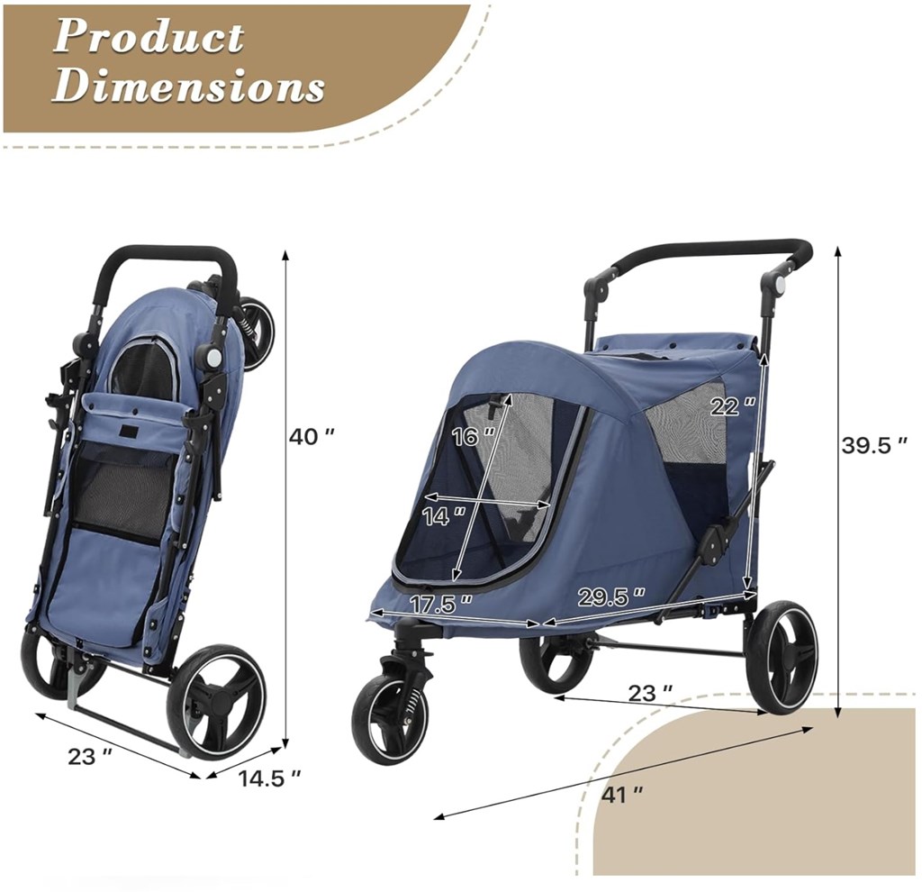Give your furry friend a comfortable ride wherever you go! This spacious and durable pet stroller is perfect for small to large pets (up to 55 lbs), featuring a smooth, shock-absorbing ride with 360° front wheels and a secure locking system. Designed with breathable mesh windows and a skylight for fresh air and visibility, it keeps pets safe and comfortable on every outing. With an adjustable handle, convenient storage pocket, and easy fold design, this stroller is ideal for vet visits, travel, or everyday adventures—especially for senior or injured pets thanks to its dual-entry access. Item Weight 16.3 Pounds Folded Size 23*14.5*40 Item Dimensions L x W x H 41"L x 23"W x 39.5"H Frame Weight 16.31 Pounds Basket Weight Capacity Maximum 55 Pounds Back Wheel Diameter 9.5 Inches Front Wheel Diameter 7 Inches