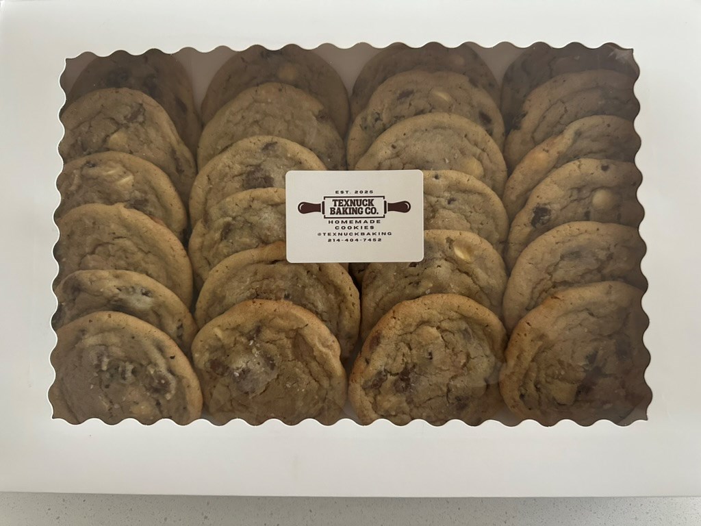 Treat yourself (or someone special!) to a deliciously sweet package from TexNuck Baking Co! This item includes two dozen freshly baked cookies, where you can choose two flavors from their classic menu, Raspberry, Chocolate Chip, Oatmeal Raisin, Oatmeal Chocolate Chip, or Peanut Butter, perfect for sharing (or keeping all to yourself!). You’ll also receive a $50 gift card to use toward any of TexNuck’s irresistible cookie creations, so the indulgence doesn’t have to end there. Perfect for celebrations, gifts, or simply satisfying your sweet tooth, this is a treat you won’t want to miss! Visit TexNuck's social media for more details about their products: https://www.instagram.com/texnuckbaking/ https://www.facebook.com/people/TexNuck-Baking-Co/61582451004773/