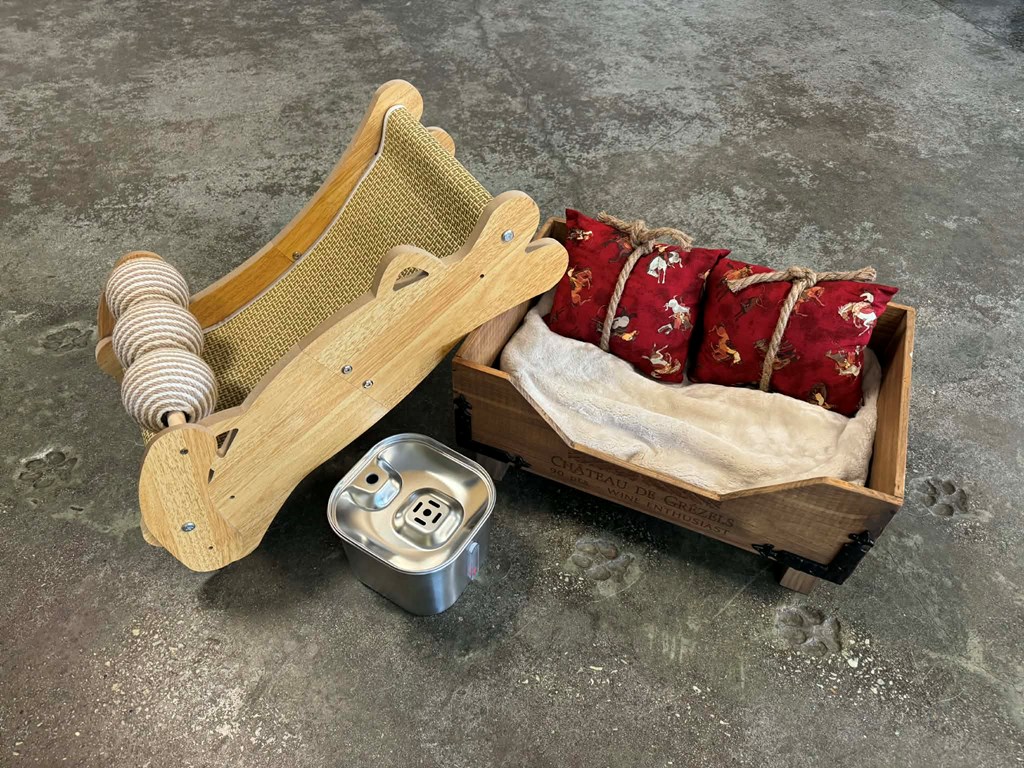 Give your feline friend the ultimate blend of comfort and style with this one-of-a-kind luxury bundle, because kitties love a little indulgence. This thoughtfully curated package features a custom cat bed crafted from a repurposed wine box, combining rustic charm with cozy relaxation, perfect for your cat to lounge in style. Paired with a sleek stainless steel automatic water fountain, your kitty will enjoy fresh, flowing water all day long, promoting hydration and health. Also included is a beautifully handcrafted wooden scratching pad, designed to satisfy natural instincts while adding a touch of artisan elegance to your home. And of course, no royal retreat is complete without a selection of delicious treats to keep your furry companion happy and spoiled. Whether you're shopping for your own pampered pet or the ultimate cat lover gift, this bundle is sure to impress.