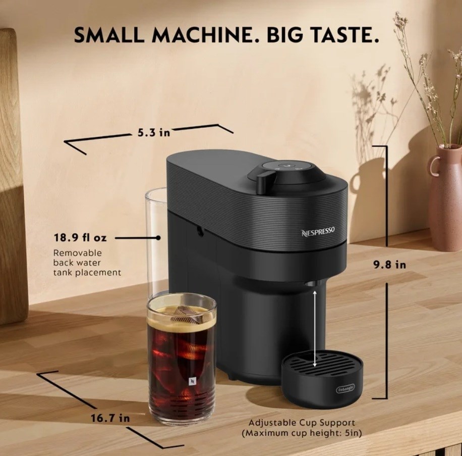 Add a touch of color to your life with the Nespresso Vertuo Pop+ machine and Aeroccino XL Milk Frother. Bursting in a range of vibrant colors, Vertuo Pop+ makes a bold statement to match your style. With five cup sizes, from Espresso to Alto and Cold Brew style coffee, simply choose your Vertuo pod, pop it in, and you’re away at the touch of a button. The included Aeroccino XL milk frother provides smooth hot or cold milk froth for your coffee recipes like cappuccino and latte. To keep you spinning, the machine reads the code on each pod to reveal its hidden treasures, from aroma to crema. The Vertuo Pop+ has a water tank accessible from the side, all in a compact design. Always connected, Vertuo Pop+ updates automatically, ensuring you get a smooth and consistent coffee experience. Product Dimensions 14"D x 8.6"W x 10.4"H
